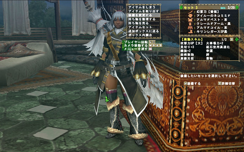 発動スキル:攻撃【大】・高耳・見切3・麻痺無効・餓狼+2・火事場力+2・砥石使用高速化・絆・業物