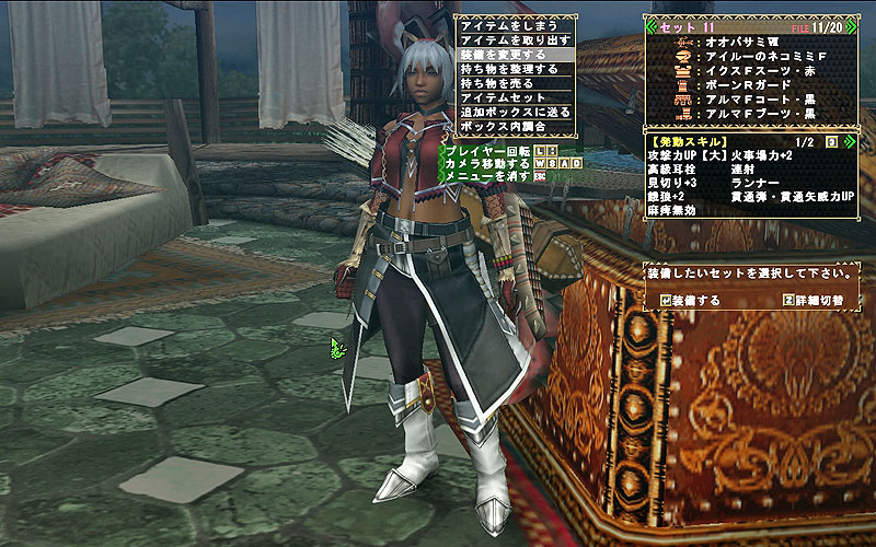 発動スキル:攻撃【大】・高耳・見切3・麻痺無効・餓狼+2・火事場力+2・連射・ランナー・貫通弾・貫通矢威力UP